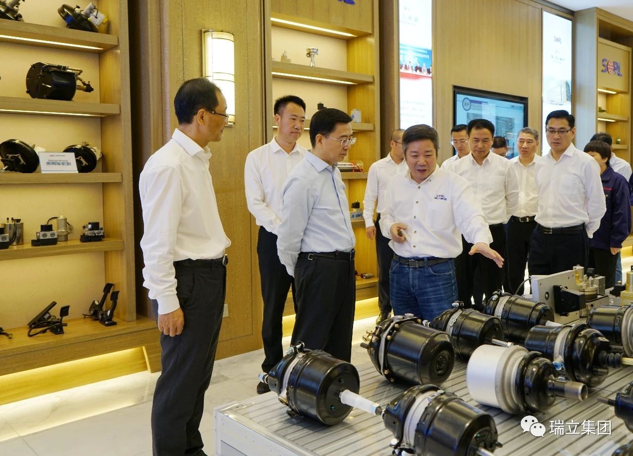 在展示廳,張曉平董事長詳細介紹了瑞立集團“從單個產品到商用車底盤制動系統、乘用車制動系統、軌道風源系統”的全產業鏈發展情況。他說,瑞立從溫州瑞安起步,立足主業,堅守實業,不斷走向全國、全球。瑞立要做頭部企業,不僅要高起點引進世界一流設備、一流人才,更要搭建產業平臺,用未來的眼光、全局的眼光、全球的眼光,保證瑞立“百億”目標的實現。